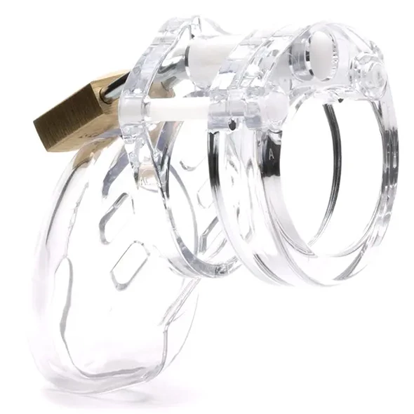 The CB-6000S is the shorter version of the CB-6000 Male Chastity Device. The CB-6000S Male Chastity Device offers the utmost in comfort and security. The ring design consists of three interlocking pieces that fit together like a puzzle. The two guide pins hold the top pieces together. The oval locking pin goes through the middle recessed hole connecting the cage portion to the ring. The flat design of the rings is extremely comfortable and secure. The CB-6000S is made of medical grade polycarbonate material. It is lightweight, hypoallergenic and durable. The cage portion is vented for hygiene and has a bottom opening allowing use at urinals.