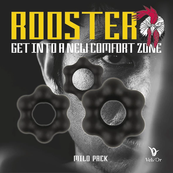 The ROOSTER MILO pack is a robust set of three cock rings. The balls on the rings give this pack a tough as well as sensual look and feel. These cock rings can be worn just on the base of your penis or around your penis and scrotum. You can basically wear them the way it makes you most efficient and goal orientated. Even though they feel soft they support your erection, making you look cool.